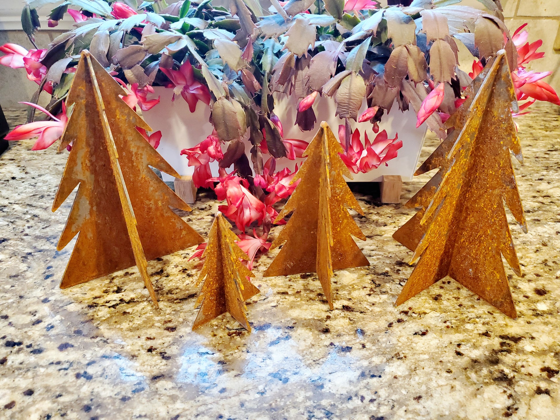 Add a touch of rustic charm to your holiday décor with this set of three metal Christmas trees. Made from durable steel, each tree—large, medium, and small—features a unique rusted patina that gives it an aged, weathered look. The natural, earthy tones of the patina enhance the industrial feel, making these trees a perfect blend of modern and vintage style. Whether arranged as a trio or scattered throughout your home, these trees bring a warm, seasonal atmosphere to any space. Ideal for creating a cozy, rustic holiday display.