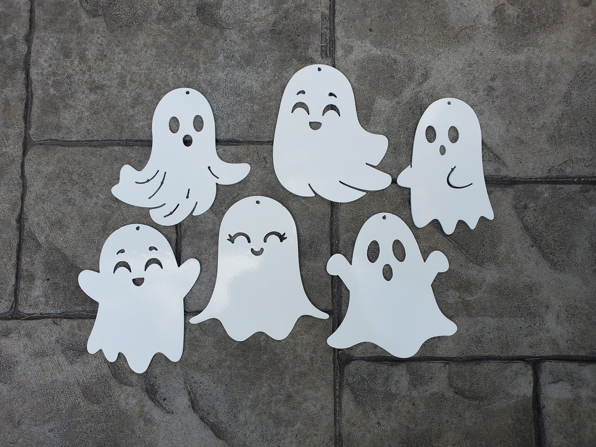 These adorable ghosts are perfect for hanging outside, on your porch, or in your trees. Each ghost is about 6" tall and is finished with a gloss white powder coat.