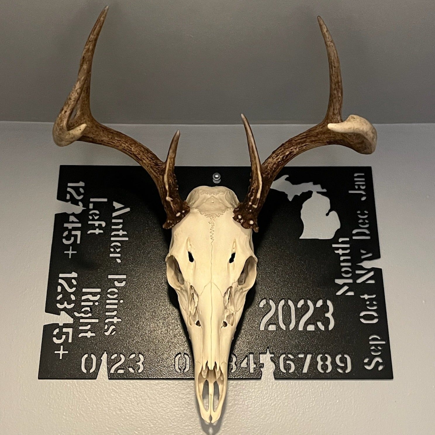 This custom metal deer tag acts as a backer for a European Deer Mount.